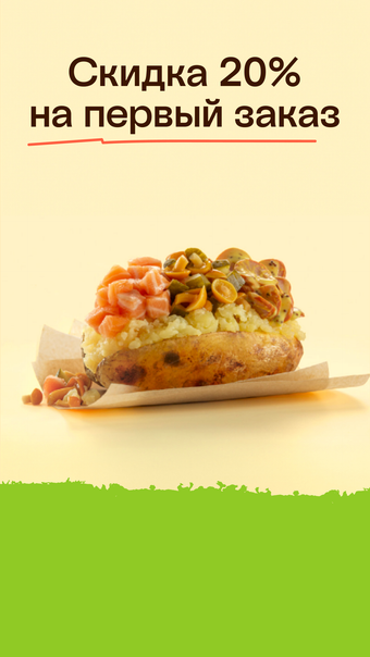 Крошка Картошка is a mobile application for a fast food restaurant chain specializing in baked potato dishes with various toppings. The app allows users to conveniently order food for delivery or pickup, featuring a 20% discount on the first order. The menu includes a diverse selection of soups, sandwiches, burgers, salads, and beverages from both Russian and international cuisines. Users can also access exclusive coupons to save on their favorite meals.